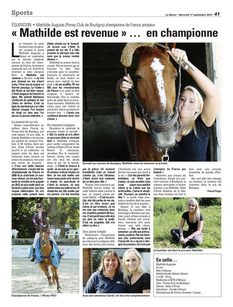 [Le 20/09/2014]: Bravo à Mathilde Auguste et sa jument Osée d'Orval ! Mathilde a remporté les championnats de France amateur 1, qui se sont déroulés à Auvers, du 31 juillet au 3 août 2014. Elle a débuté l'équitation aux Écuries et Poney-Club de Boutigny, où elle monte depuis 14 ans. Mais elle déménage et va désormais monter dans l'Aisne. Nous lui souhaitons, à elle et Osée, plein de bonnes choses.